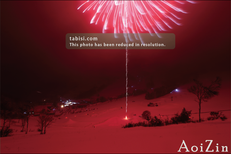 大晦日の花火。ナイターが終わり、スキー場の照明が暗くなり、花火が15分上がった。